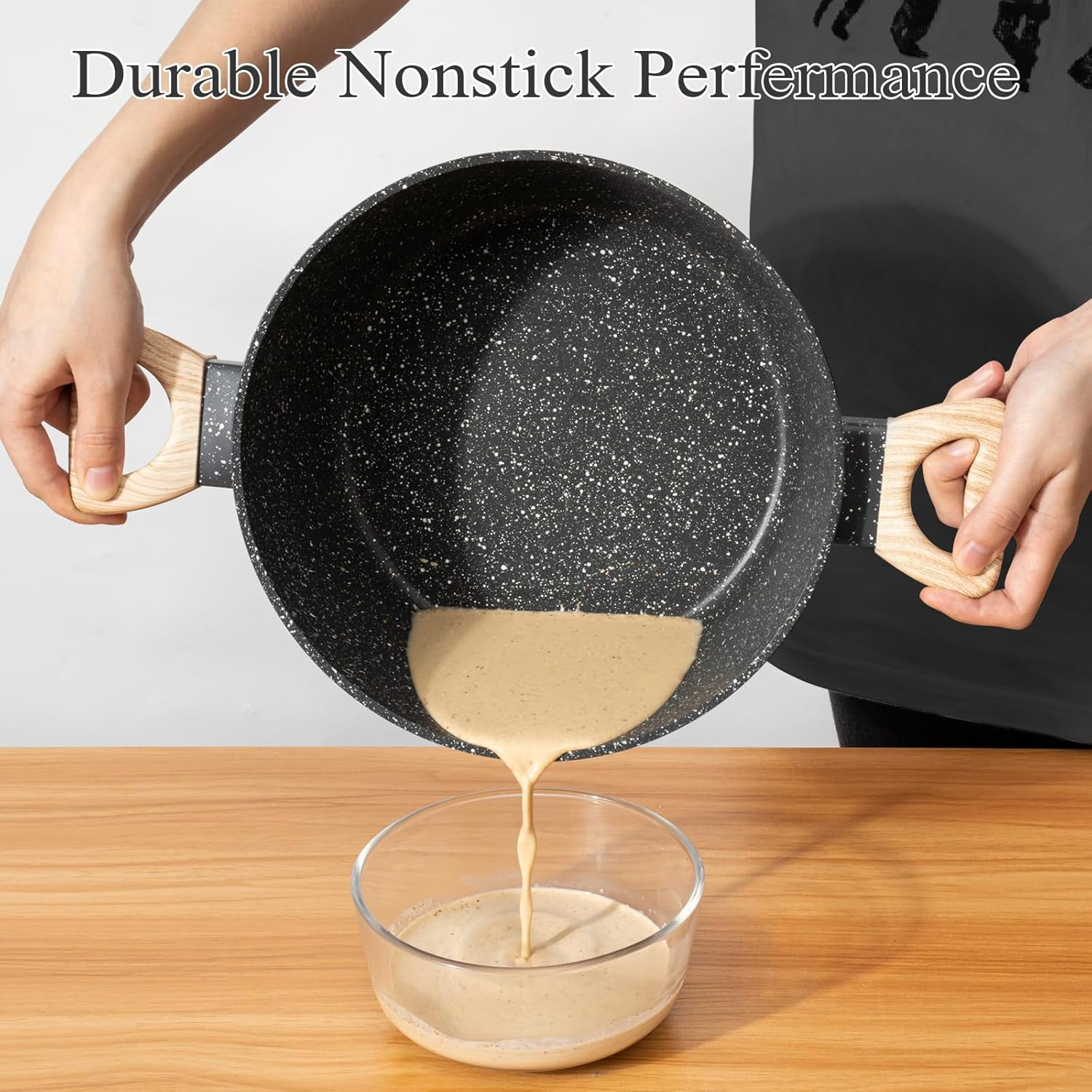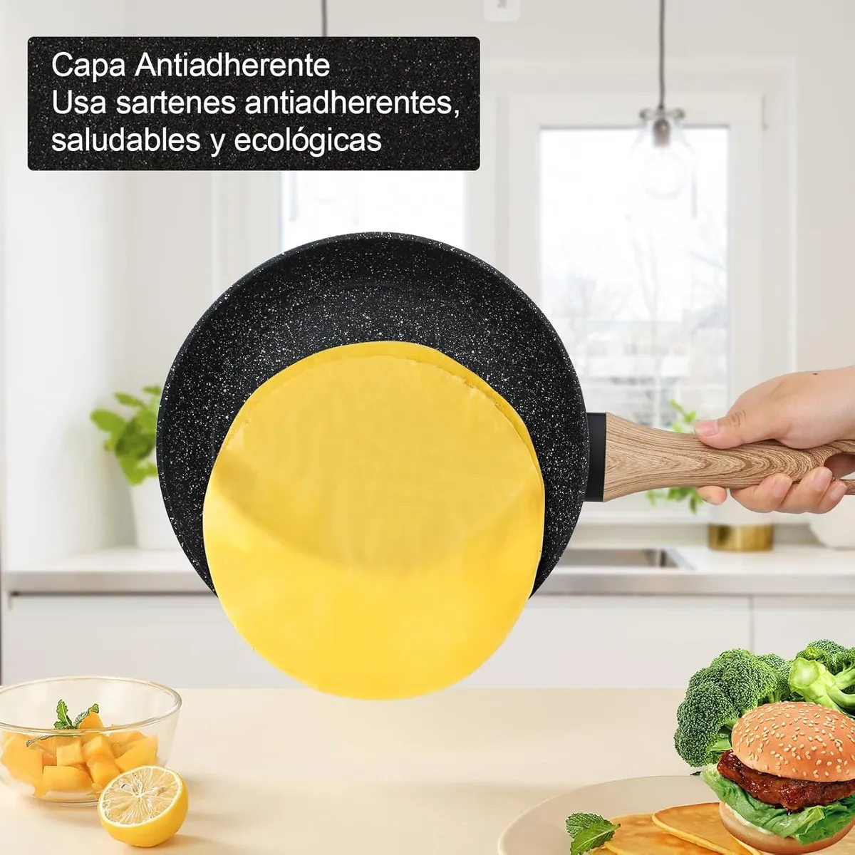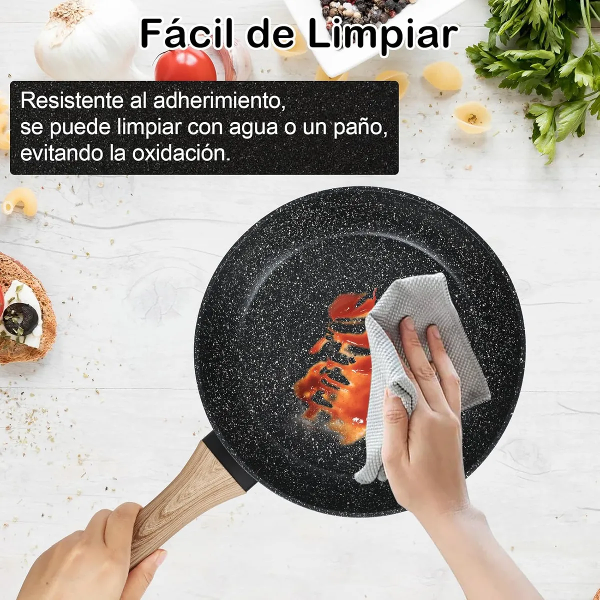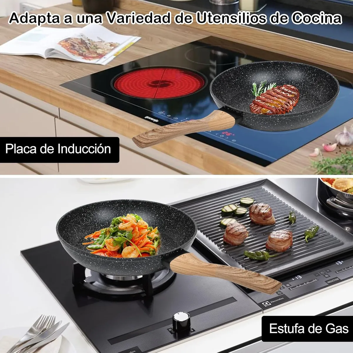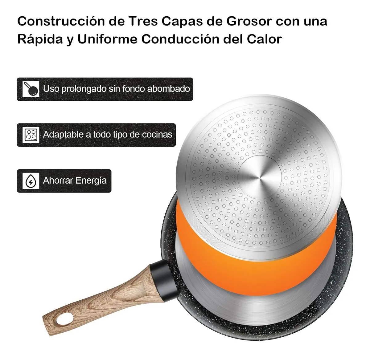 Fabricada con recubrimiento antiadherente tipo granito, compatible con inducción, gas, eléctrica y vitrocerámica.