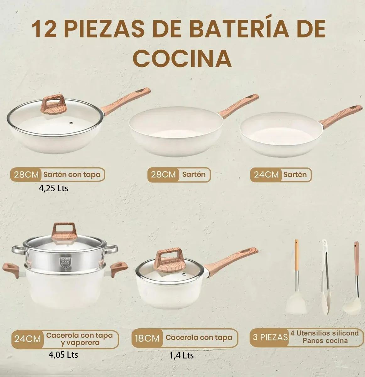 Set completo de batería de cocina de 12 piezas, ideal para cocinar todos los días con comodidad, estilo y excelentes resultados.