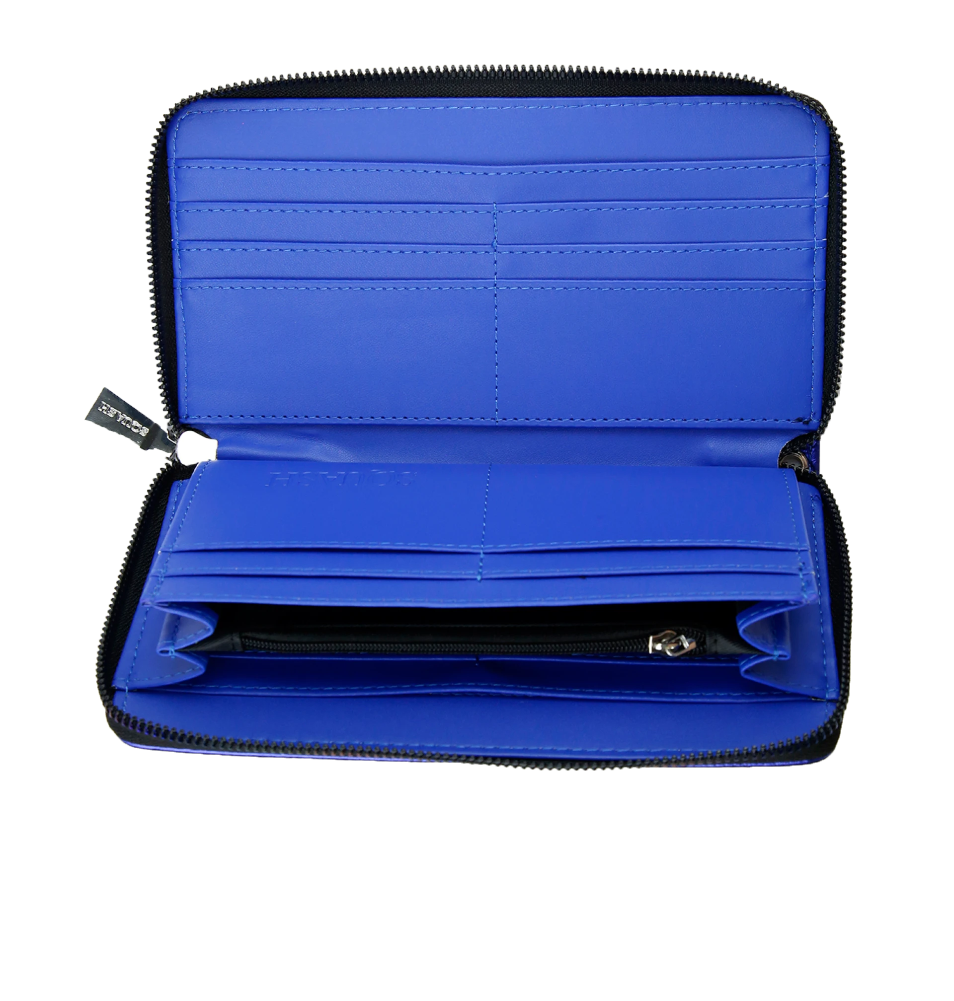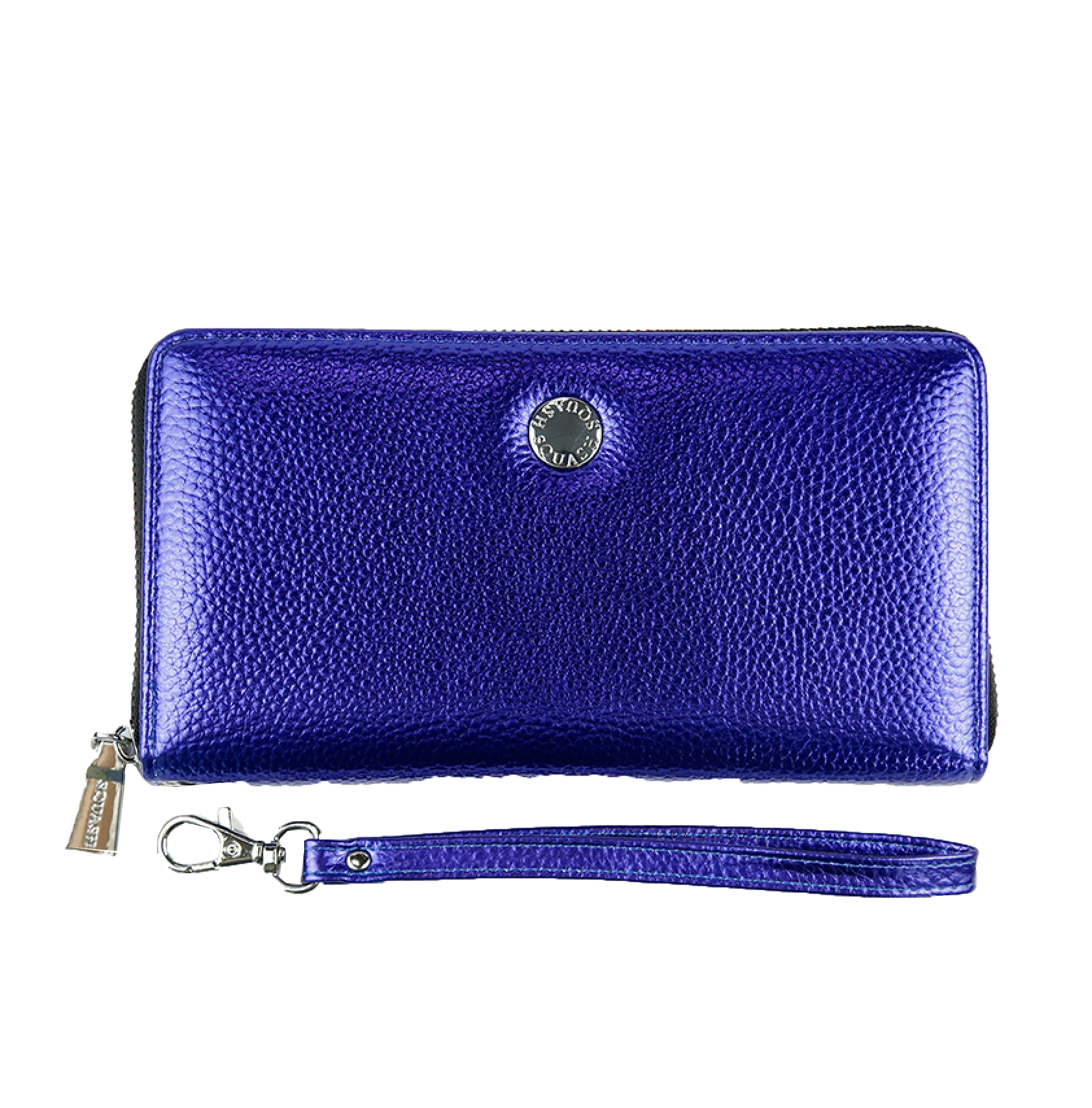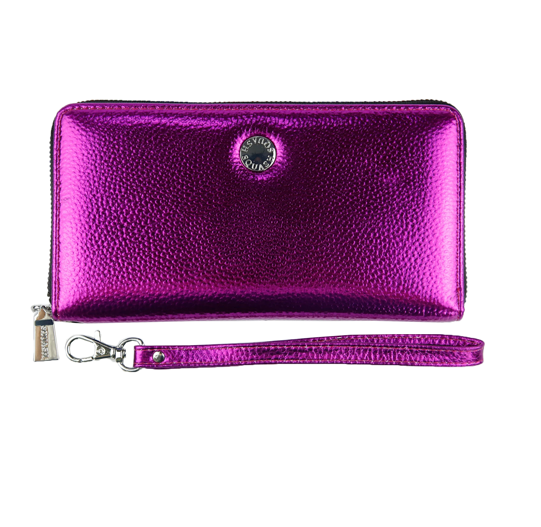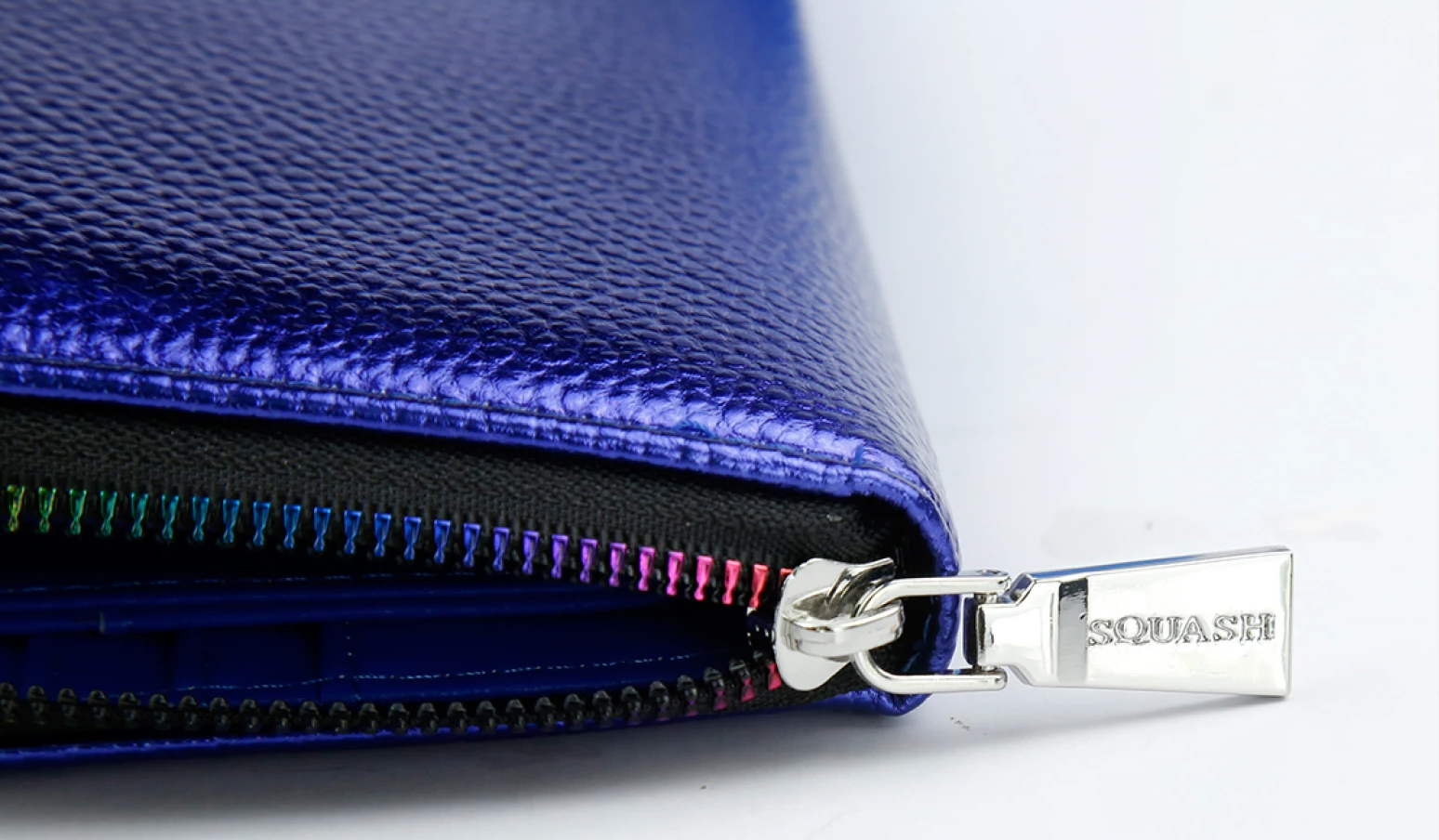 Billetera con cierre metálico en degradé de colores y botón con logo grabado.