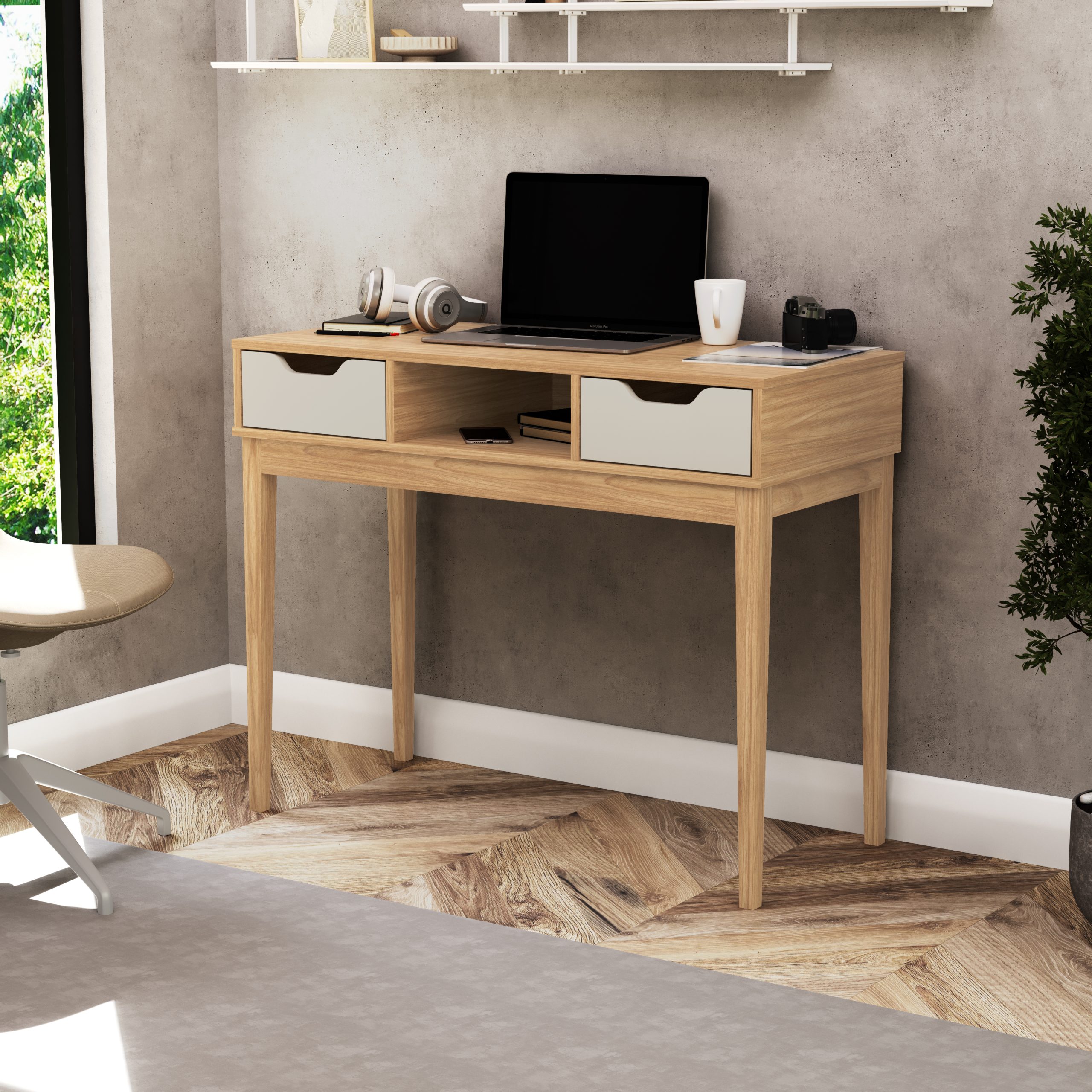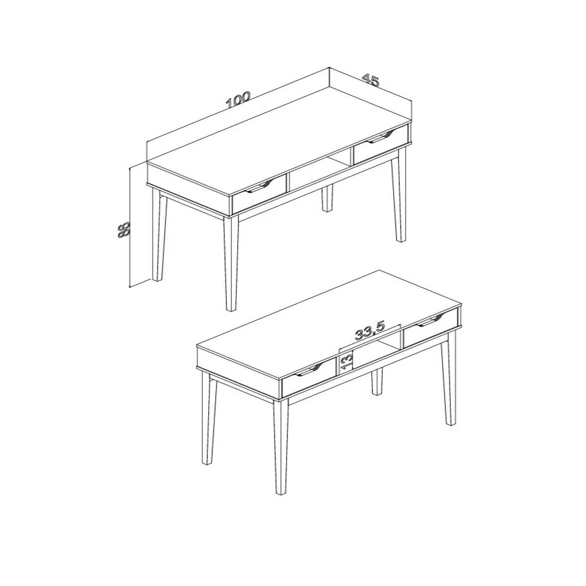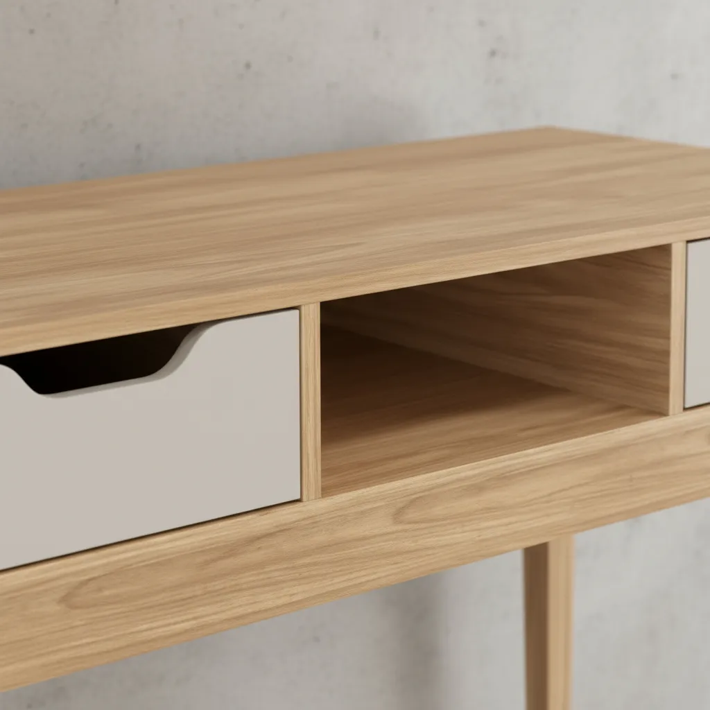 Este escritorio con 2 cajones combina un estilo moderno y elegante con la máxima funcionalidad. Sus sólidas patas de madera y el diseño limpio aportan calidez a cualquier rincón, mientras que sus cajones con correderas y nicho abierto te dan la organización que necesitas para enfocarte. Crea tu ambiente perfecto de trabajo o estudio.