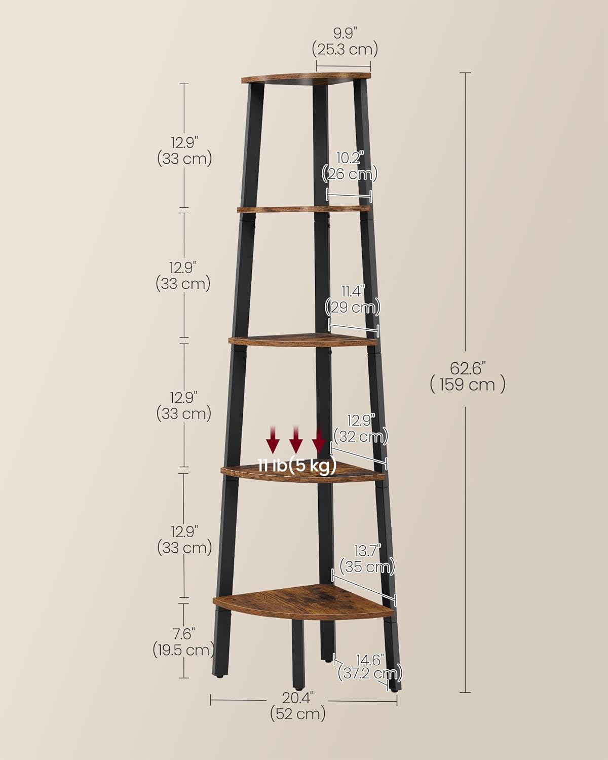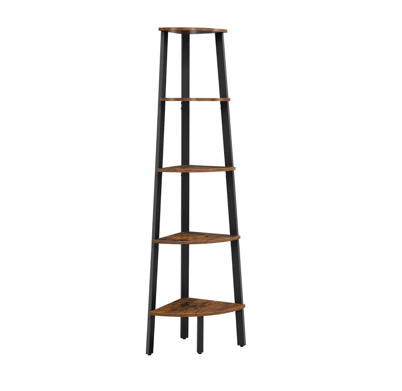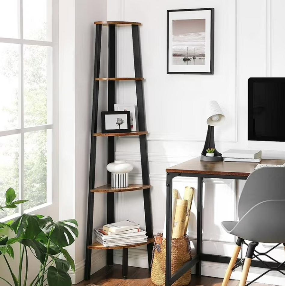 Estantería de 5 niveles con diseño esquinero tipo escalera, ideal para aprovechar espacios y sumar organización con estilo industrial. Su estructura metálica resistente combinada con estantes en tono madera permite exhibir libros, plantas u objetos decorativos de forma ordenada y segura.