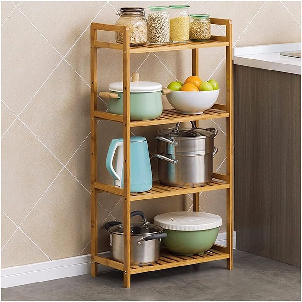 Estantería práctica y funcional, ideal para organizar y optimizar espacios en cocina, baño, dormitorio o living. Cuenta con 4 estantes amplios que permiten almacenar ollas, electrodomésticos pequeños, frascos, frutas, plantas u objetos decorativos de uso diario.