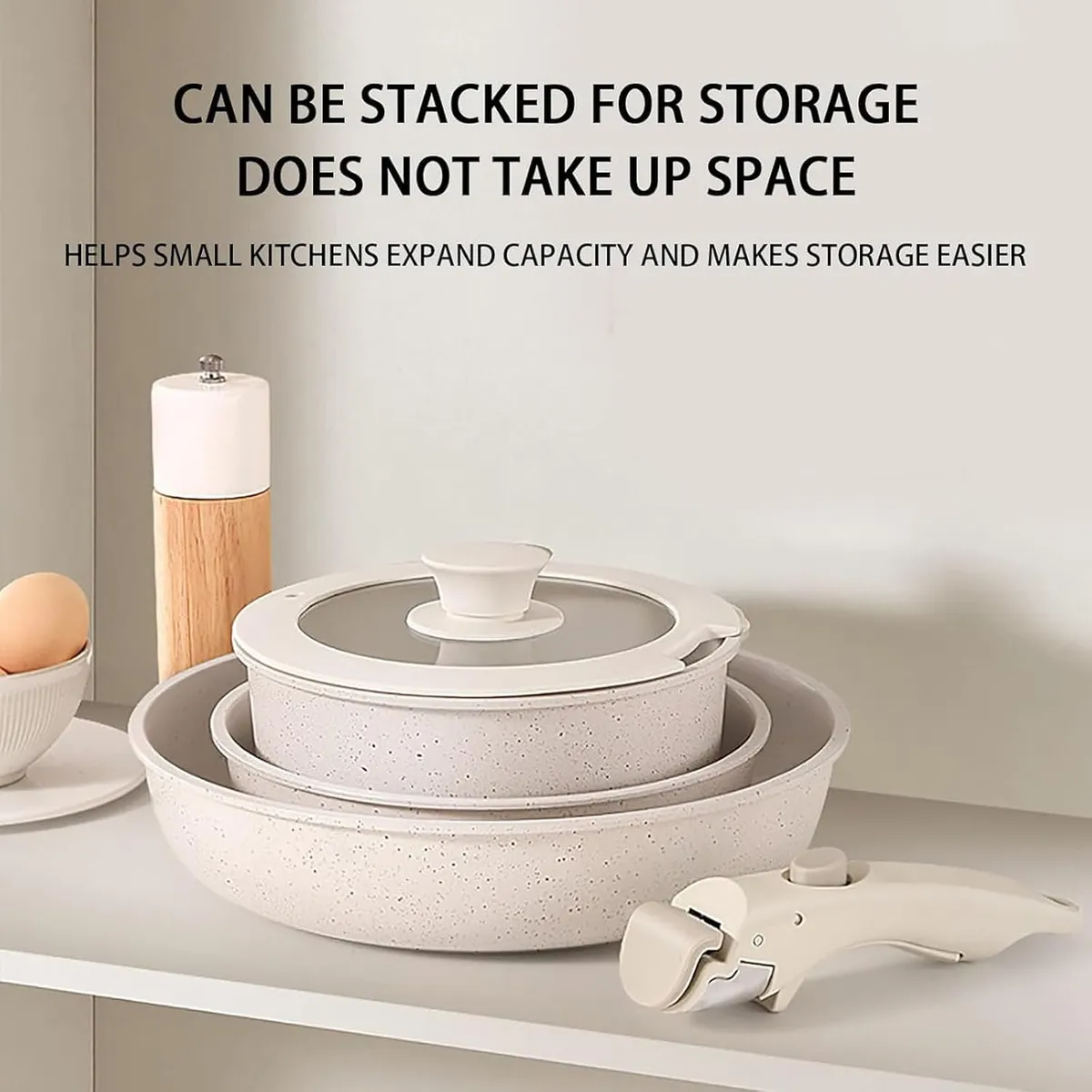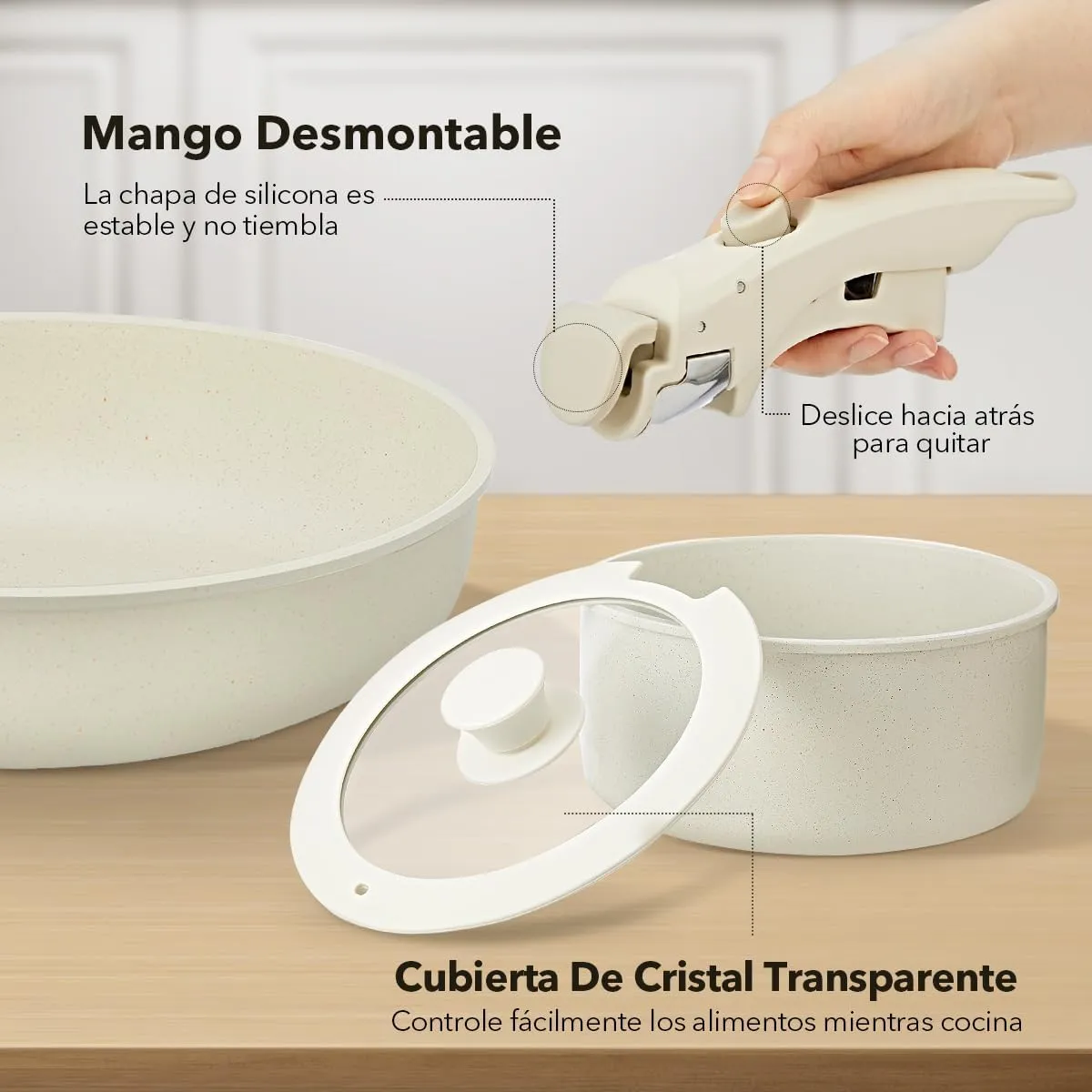 Diseño moderno con mango removible y tapas de vidrio templado.