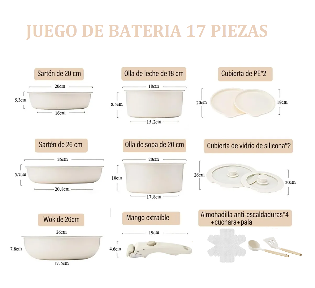 Set completo de batería de cocina de 17 piezas, ideal para cocinar todos los días con comodidad, estilo y excelentes resultados.