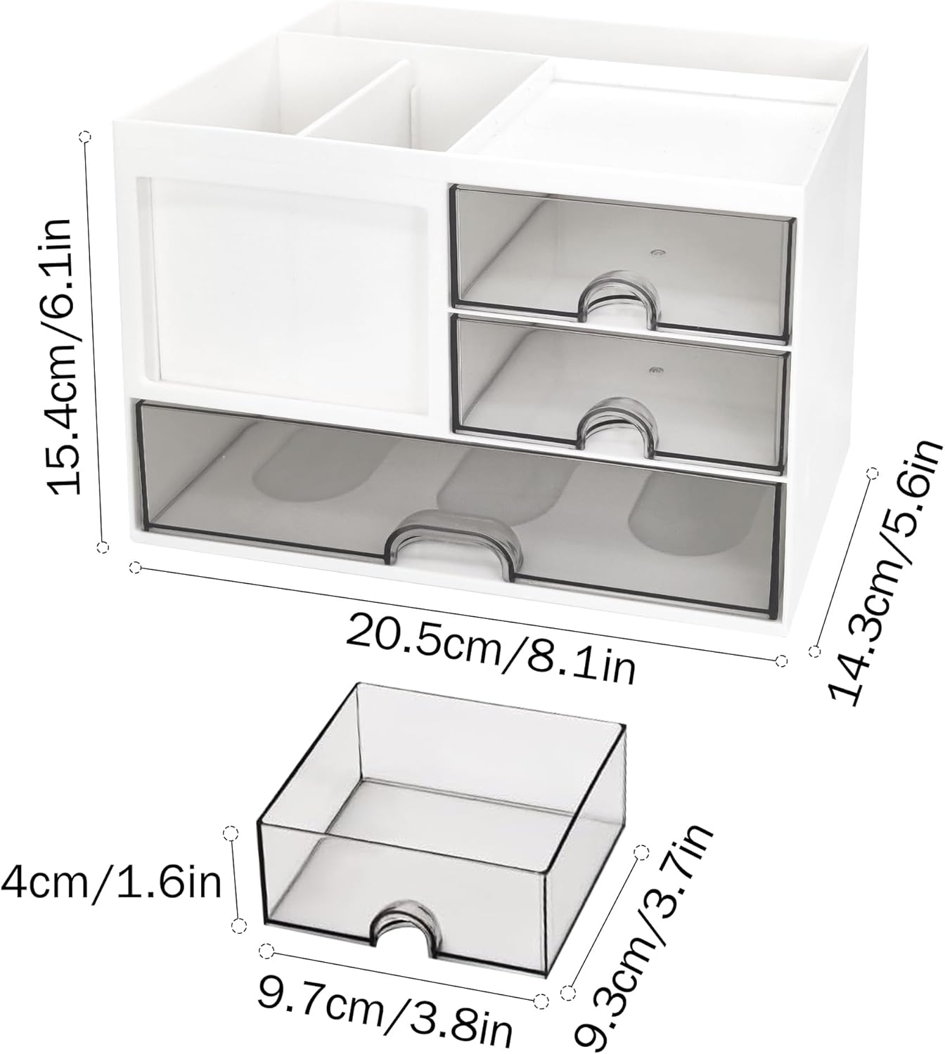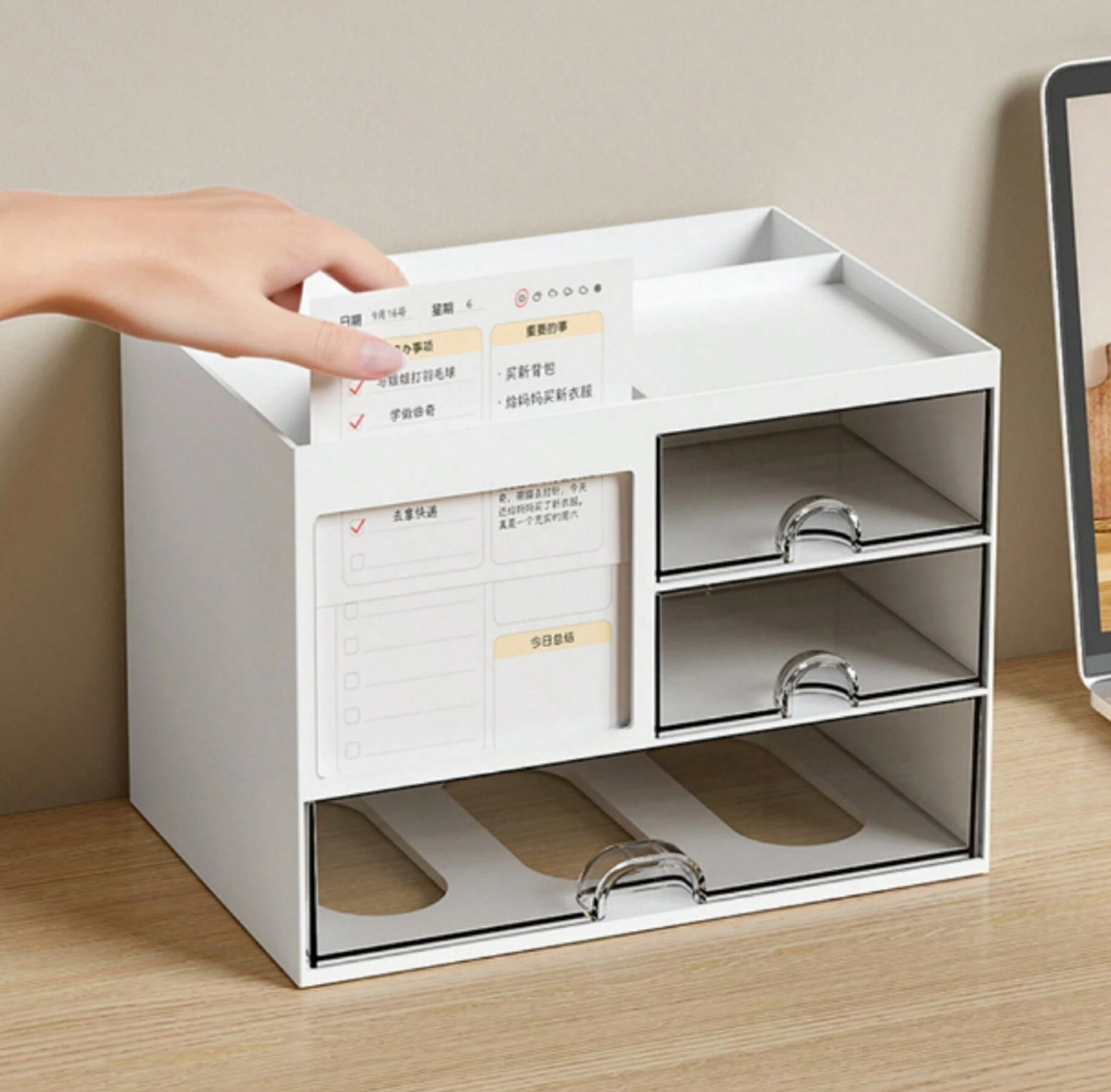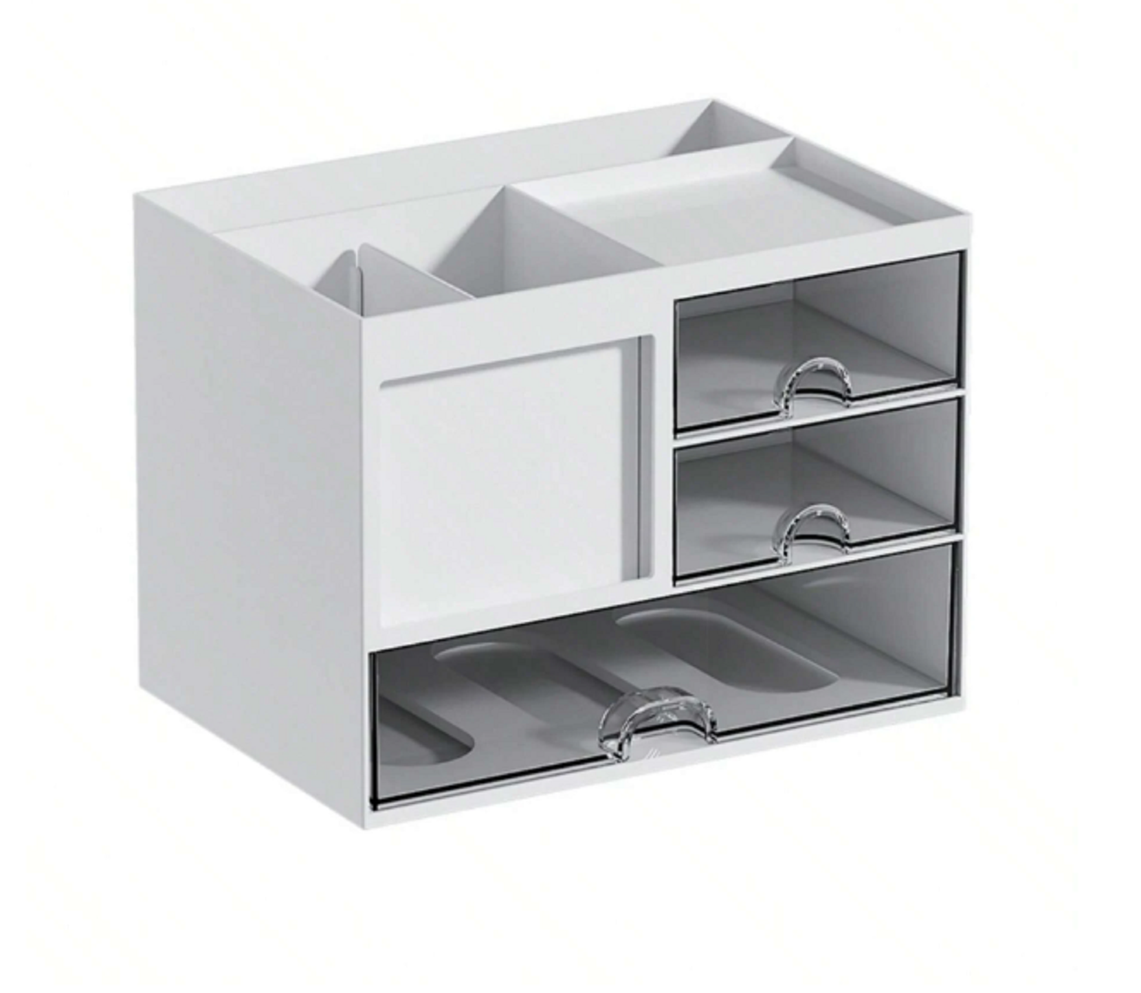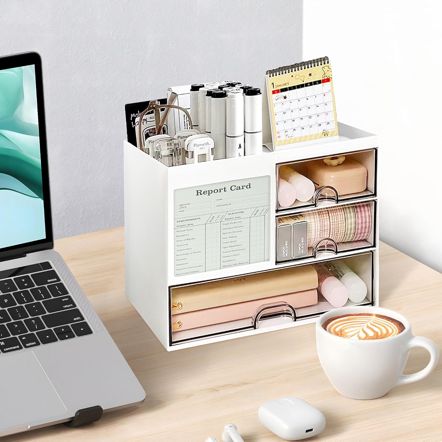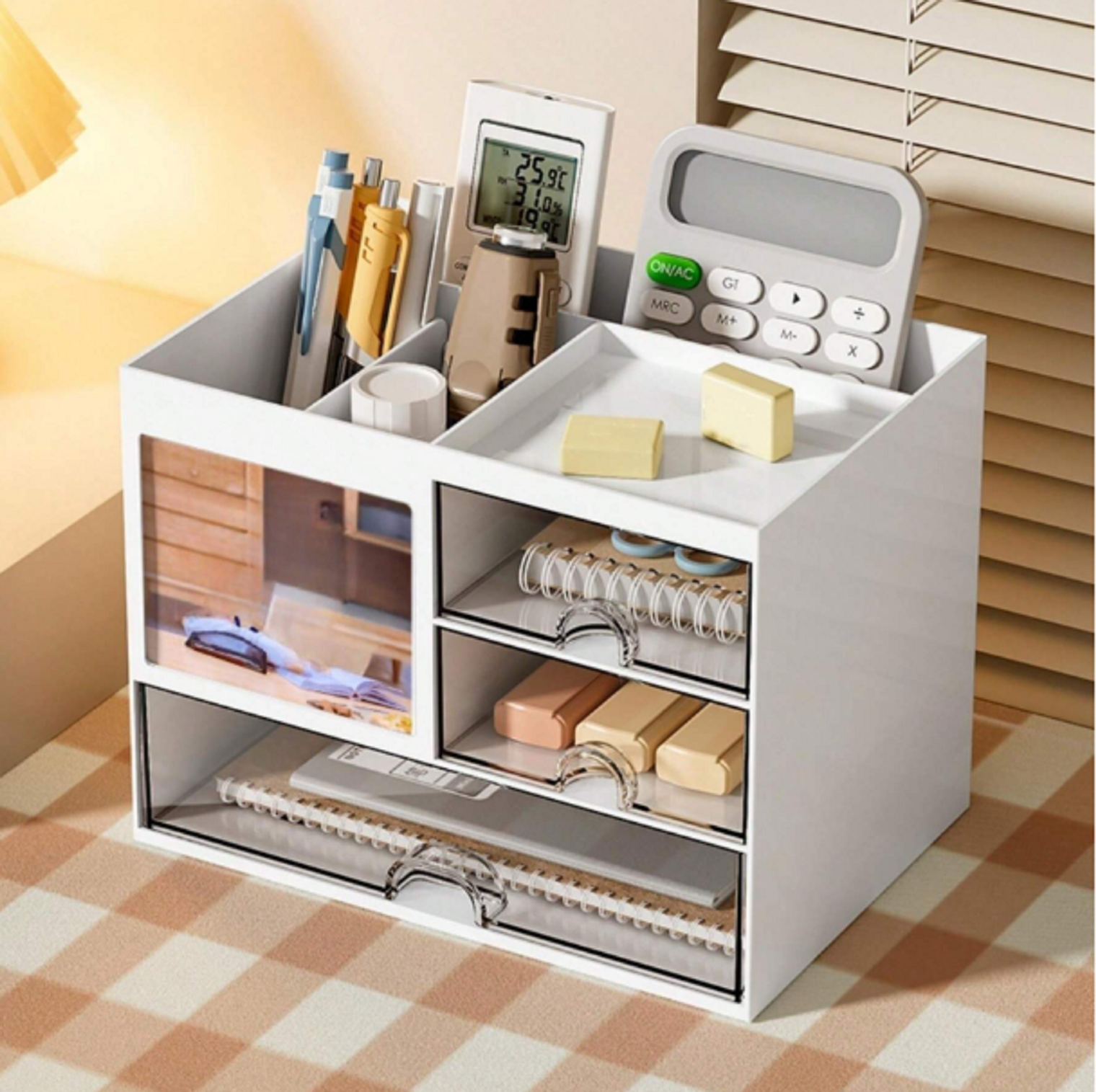 Organizador de escritorio versátil con soportes para lapicera o lápices, bandeja superior, soporte para cuaderno, ranura para notas y 3 cajones. Fabricado en plástico ABS duradero, fácil de limpiar.
